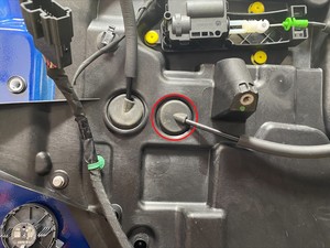 - Push the LH front door release motor cable grommet into the LH front door closeout panel.