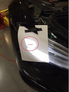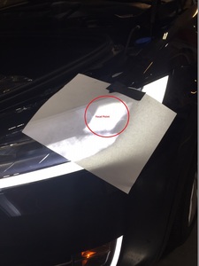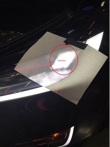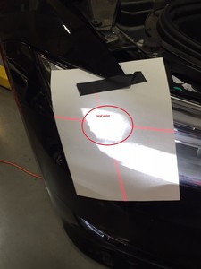 - Apply white sheet of paper to RH headlamp to locate the focal point of low beam