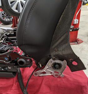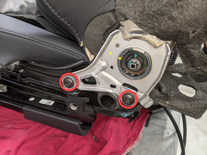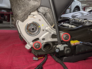 With assistance, position the front passenger back rest on the seat frame, and then install the bolts (x4) that attach the back rest to the seat frame.
