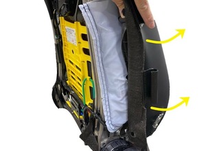 - Release the tab that attaches the LH side of the front passenger seat back trim assembly to the seat, and then move the trim aside for access.