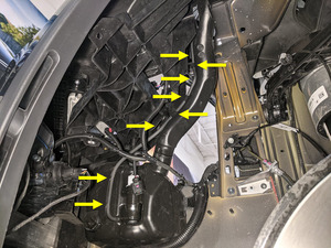 - Release the reservoir washer hose from the hooks (x6) and tabs (x2) on the windshield washer reservoir, and then remove the hose from the vehicle.