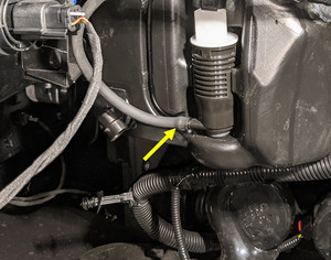 - Position the reservoir washer hose onto windshield washer reservoir, and then secure the hose into the hooks (x6) and tabs (x2) that attach the hose to the reservoir.