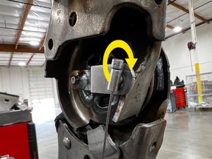 - Rotate the LH side hinge lever 90 degrees to align the tab, and then pull the recline release actuator cable away from the hinge lever to release it.
