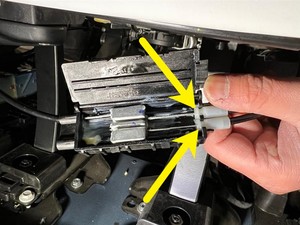 - Hold the RH side hinge lever down to allow the cable to reach the hole, insert the cable end, and then rotate 90 degrees to secure.