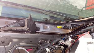 - Position the LH active spoiler catch basin into the center of the liftgate gap, turn the catch basin counter clockwise, and then install a new fir tree clip that attaches the catch basin to the liftgate.