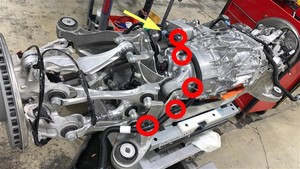 - Remove the bolts (x4) that attach the rear subframe stiffener to the rear subframe, and then remove the stiffener from the subframe.