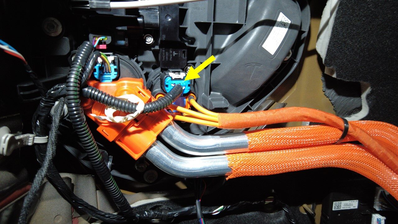- Release the white locking tab, then disconnect the DC logic connector from the charge port assembly.
