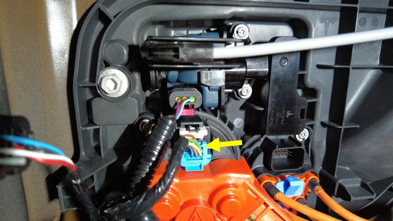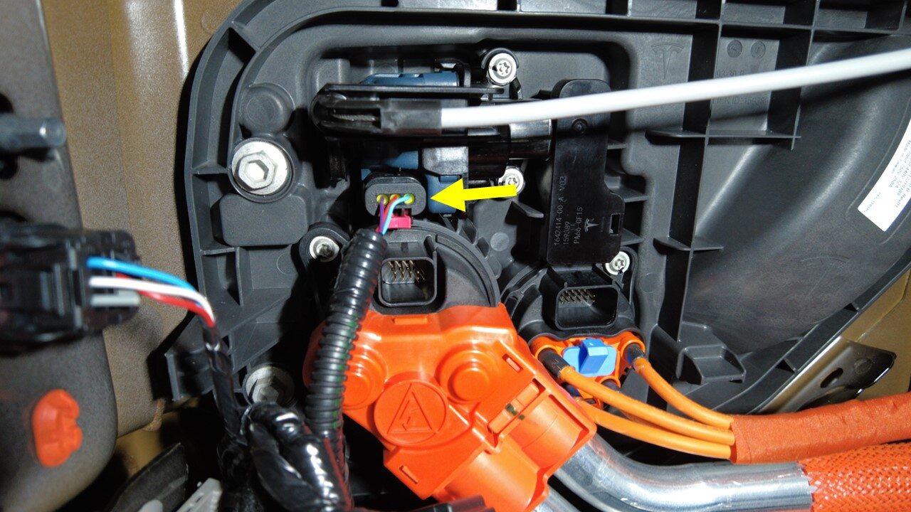 - Connect the charge port actuator logic connector to the charge port assembly.