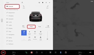 NoteVia center display > Controls > Trunk > Open Passenger > Open Driver > Open LH FWD > Open RH FWD