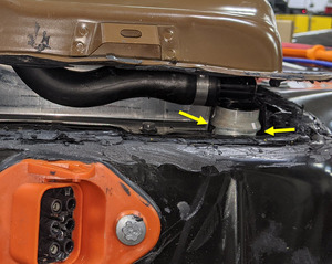 - Release the clip that attaches the power conversion system outlet hose to the HV battery.