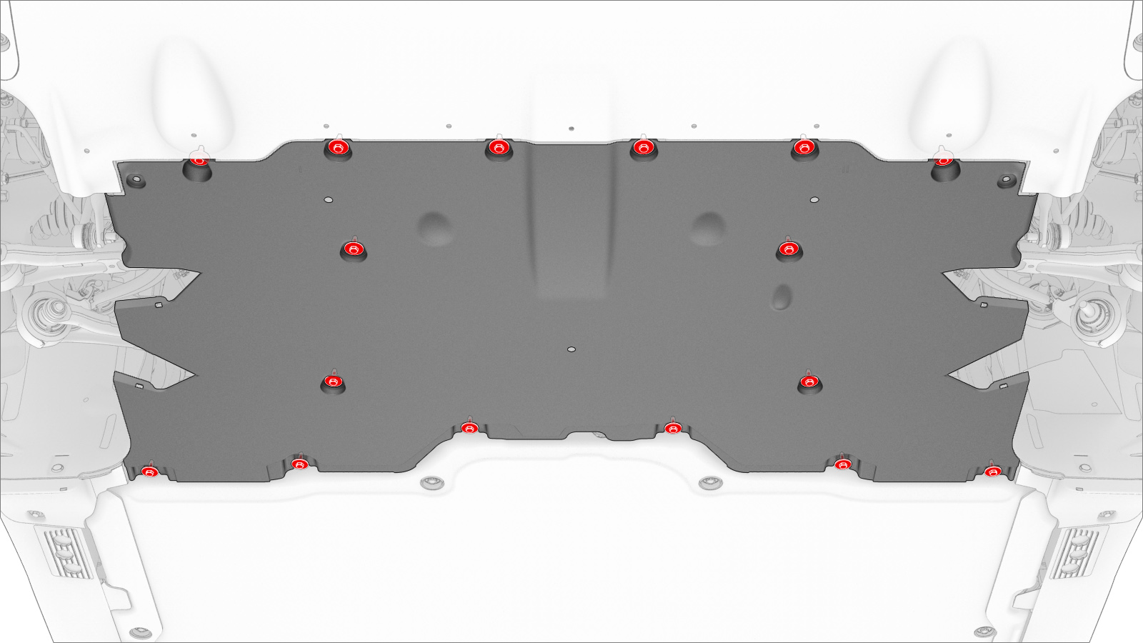 | Bolts (x16) that attach the mid aero shield panel to the vehicle |