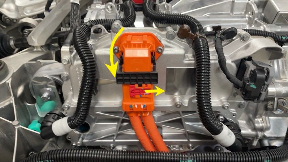 - Slide the red connector locking tab, open the black release lever, and then disconnect the rear drive unit LH HV harness from the LH inverter of the rear drive unit.