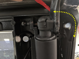 - Remove the C-clip that secures the LH rear door front primary strut to the upper door, release the harness clip, and then remove the front primary strut from the upper door.