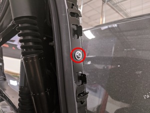 - Remove the C-clip that secures the LH rear door rear primary strut to the upper door, release the harness clip, and then remove the rear primary strut from the upper door.