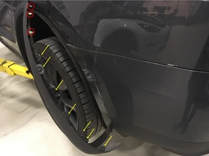 - Secure the clips (x3) and tabs (x7) that attach the LH rear fender garnish to the rear fascia assembly.
