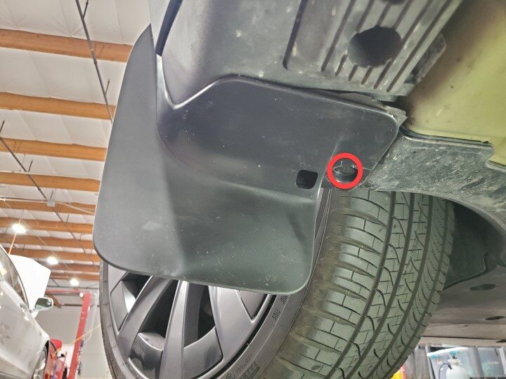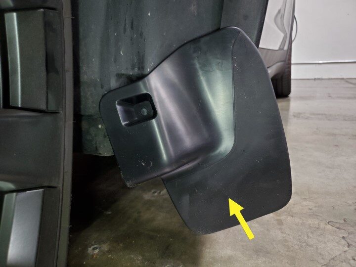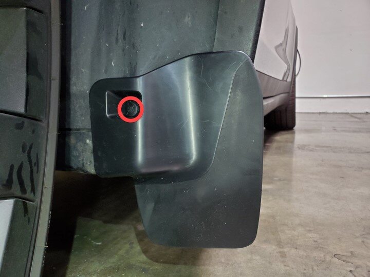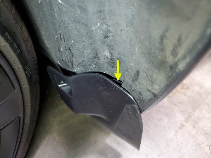NotePosition the mudflap at an angle to aatch the tab behind the garnish, and then rotate the mud flap into position, Use a prytool to secure the tab.