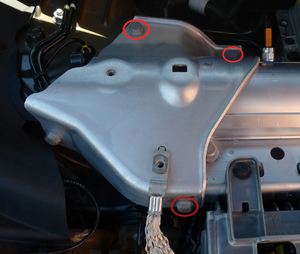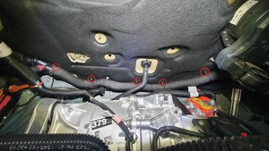 Remove the fan clips (x2) that attach the front bulkhead motor bay noise absorber to the vehicle.