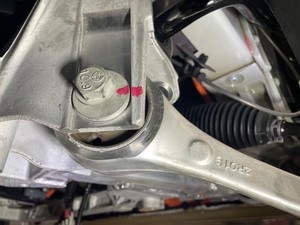 | Bolt and nut that attach the front lower fore link to the subframe |