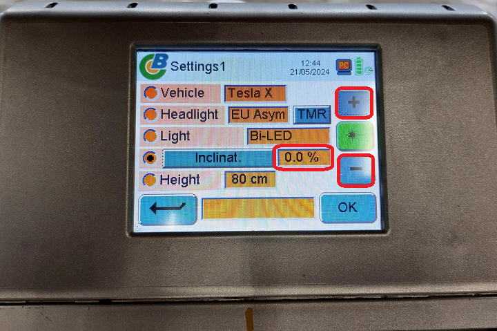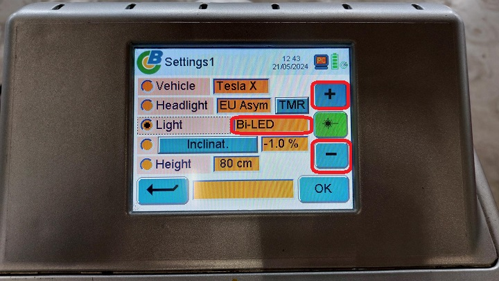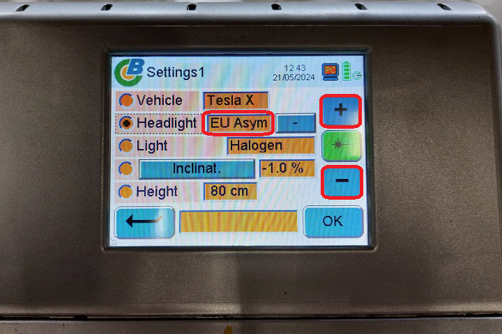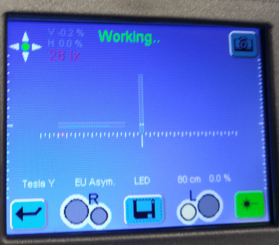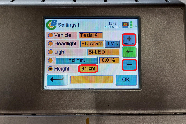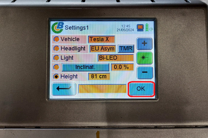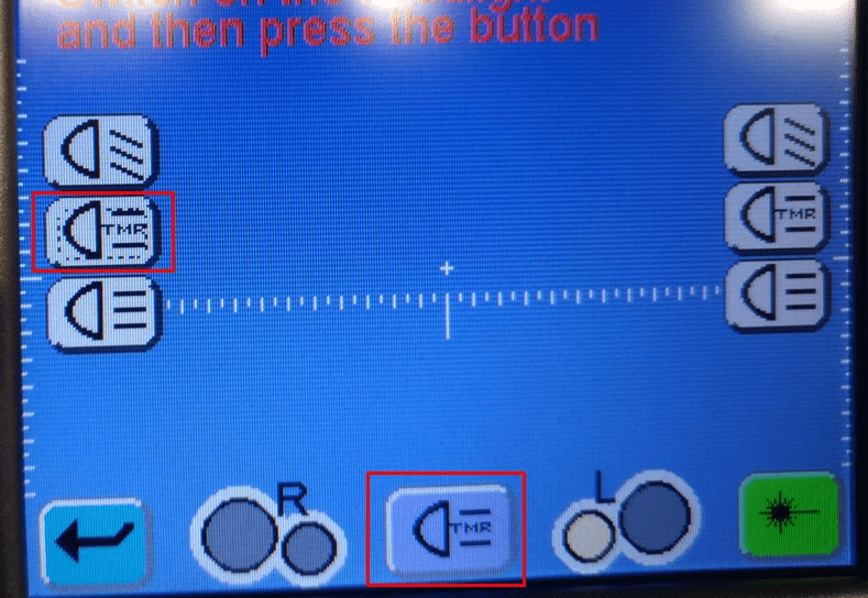 - Select the laser icon and adjust the tester horizontal and vertical position to align with the LH headlight markings.