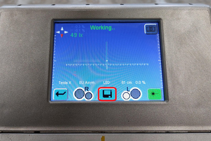 - On the headlight tester tool, press the "Save" button to record the results for the LH headlight.