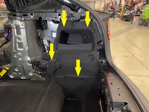 - Position the RH trunk side trim into the vehicle, connect the electrical connectors (x2), and then install the push clips (x4) that attach the side trim to the vehicle.