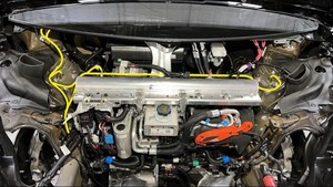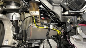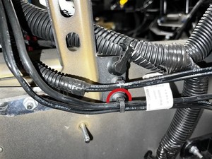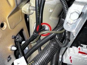 - Release the clip that attaches the front bundle to the RH shock tower assembly.