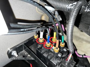 NoteRemove the white plugs when the air lines are ready to be installed.NoteFully insert the air line into the fitting. It should sit between the two white marks on the air lines. Verify air lines are properly seated by performing push-pull test. - Fasten the clips (x3) that attach the front bundle to the superbeam.