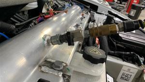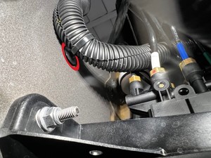 NoteRemove the white plugs when the air lines are ready to be installed.NoteFully insert the air line into the fitting. It should sit between the two white marks on the air lines. Verify the air lines are properly seated by performing a push-pull test. - Position the air suspension line compressor to valve air line onto the vehicle, and then fasten the clip onto the air compressor bracket.