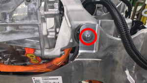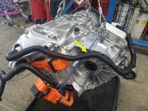 - Remove the clip that attaches the inverter to oil cooler hose to the LH rear drive unit mount.