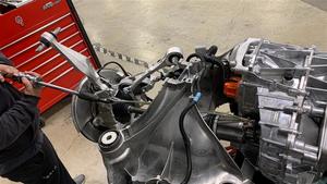 - Move the rear subframe and subframe lift out from underneath the rear drive unit.