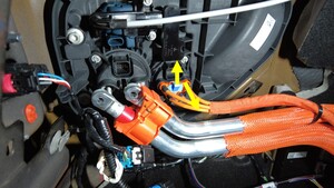 - Remove the white locking tab and disconnect the DC logic connector from the charge port assembly.