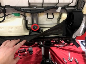 - Release the J-hooks (x11) that attach the underside of the LH 2nd row seat upholstery to the seat assembly.