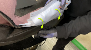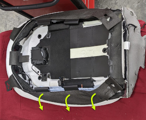 - Fasten the tabs (x2) that attach the lower portion of the driver seat backrest lumbar support to the seat back frame.
