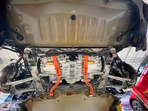 - Raise the subframe lift until the subframe just makes contact with the body, and then use the power tool to install the bolts (x4) that attach the rear subframe to the body.