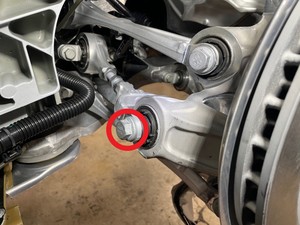 Note1x bolt, 1x nut, 21mm, 150 Nm, Recommend assistance, Use shop towel and prevent marring on the air spring module, Line up air spring module with knuckle utilizing pry bar, Torque at later step.