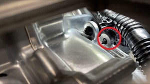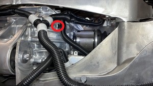 - Release the clip that attaches the rear drive unit inverter inlet hose to the LH side of the gearbox, and then move the hose aside.