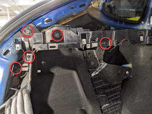 - Remove the LH rear trunk crush can trim. See Trim - Crush Can - Rear Trunk - LH (Remove and Replace).