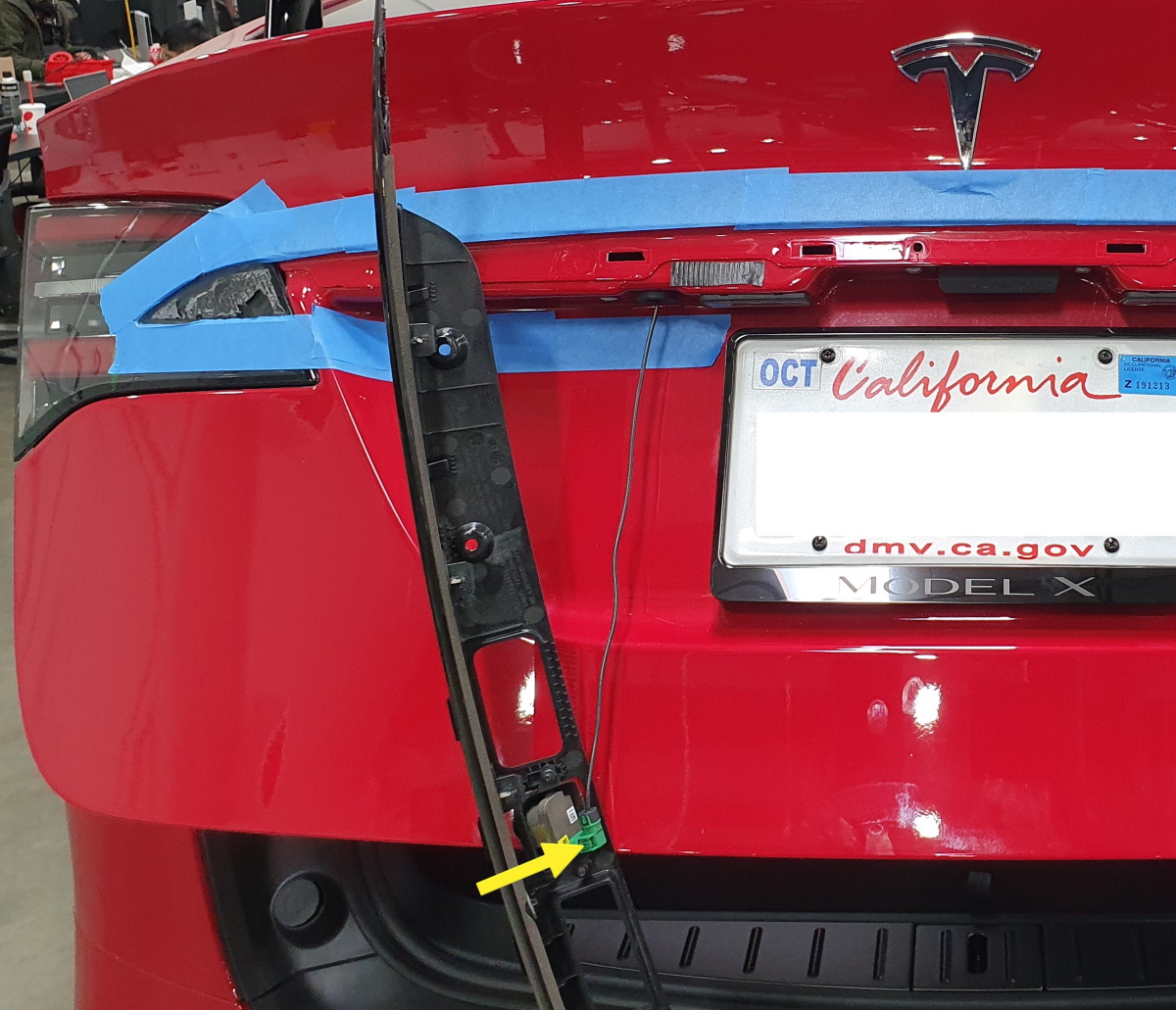 - Secure the rear facing camera electrical connector on the liftgate applique bracket, and then connect the camera electrical connector.