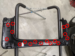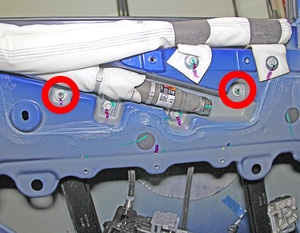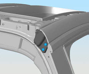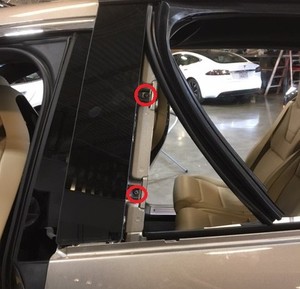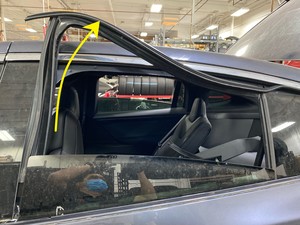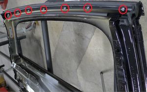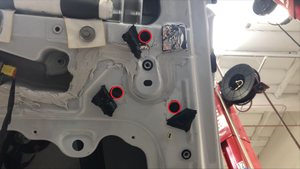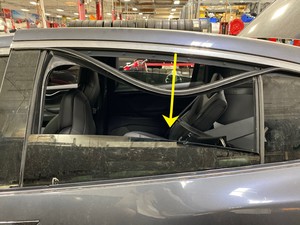 Note5x patched screws, T25, 3.5 Nm, Install new patched bolts, Carefully lift up airbag to access the lower screws, Place upper edge of fixed glass assembly in between cantrail seal, Position fixed glass to lineup with the rivnuts, Insert and secure fixed glass seal onto door assembly