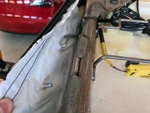 Starting from the front, lift the trunk carpet over the harpoon brackets, and then fold the carpet rearwards.