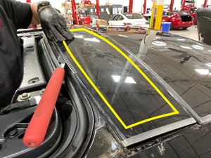 NoteStarting from the front, use a hydroblade to cut through and work around the center spine applique.NoteSeparate the urethane from the applique; partially lift the LH side of the applique to gain access to the RH side.NoteUse glass cleaner to lubricate the blade.NoteCarefully release the clips from the center spine applique, but do not damage the seal on the RH upper glass.