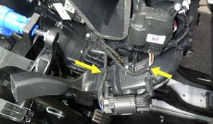 - Install the tabs (x2) that attach the HVAC harness to the LH floor actuator, and the duct temp sensor to the LH floor duct assembly.