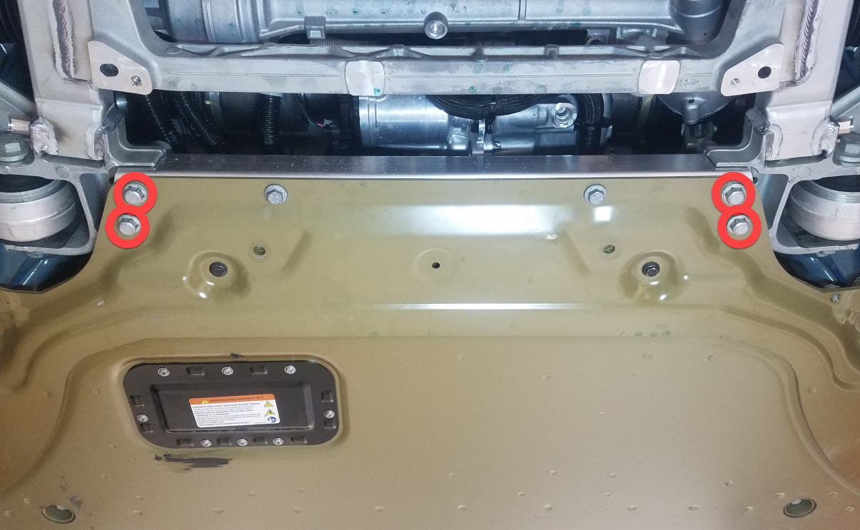 - Remove the larger bolts (x4) that attach the front skid plate to the front subframe, and then remove the skidplate from the vehicle.