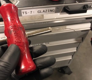 Use the T-handles to cut the urethane that attaches the backlight glass to the liftgate.