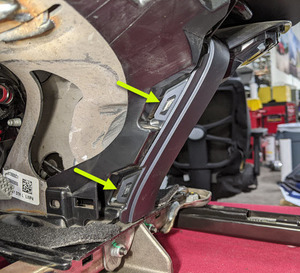 - Position the LH 2nd row seat rear trim strip onto the seat assembly, and then secure the tabs (x5) that attach the trim strip to the assembly.