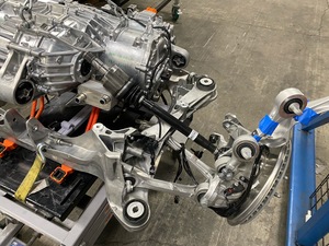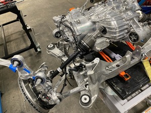 - Move the rear subframe and subframe lift out from underneath the rear drive unit.