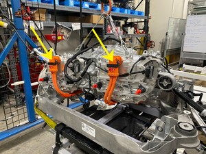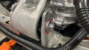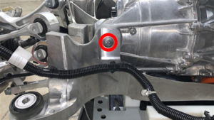- Lower the rear drive unit sling tool so as to install and hand tighten the bolt that attaches the rear drive unit to the rear of the rear subframe.