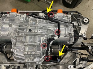 - Install the LH inverter to LH heat exchanger hose to the rear drive unit, and then fasten the clips (x4) that attach the hose to the drive unit.