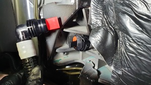 Release the spring clip that attaches the power control system to rear hose to the powertrain return hose, remove the anti-rattle foam pieces (x2) from the vehicle, and then install coolant plugs on the hoses.