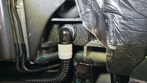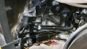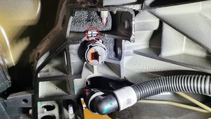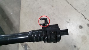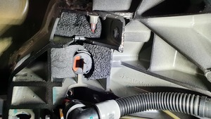 Install the spring clip that attaches the power control system to rear hose to the powertrain return hose, and then install the anti-rattle foam pieces (x2) on the vehicle.